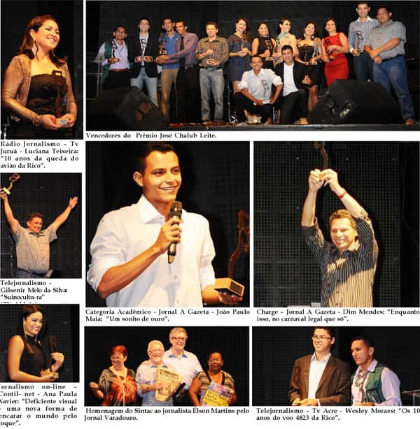 A 13ª edição do Prêmio José Chalub Leite, que este ano marcou o encerramento do 35º. Congresso Nacional de Jornalistas, mais uma vez foi um grande sucesso. Organizada pelo Sindicato dos Jornalistas do Acre, a entrega da premiação já faz parte das festas mais tradicionais de nossa querida Rio Branco. A versão 2012, na Maison Borges, primou pelo bom gosto e, mais uma vez, pela organização. Gente bonita, simpática celebrando a vida e seus prêmios. A tertúlia foi tão boa que varou a madrugada. Parabéns aos vencedores, em especial ao diagramador e chargista de A GAZETA Dim Mendes e ao jornalista João Paulo Maia agraciados com dois prêmios da noite. As fotos de Diego Gurgel contam um pouco de como foi essa bela noite de comemoração dos jornalistas acreanos.