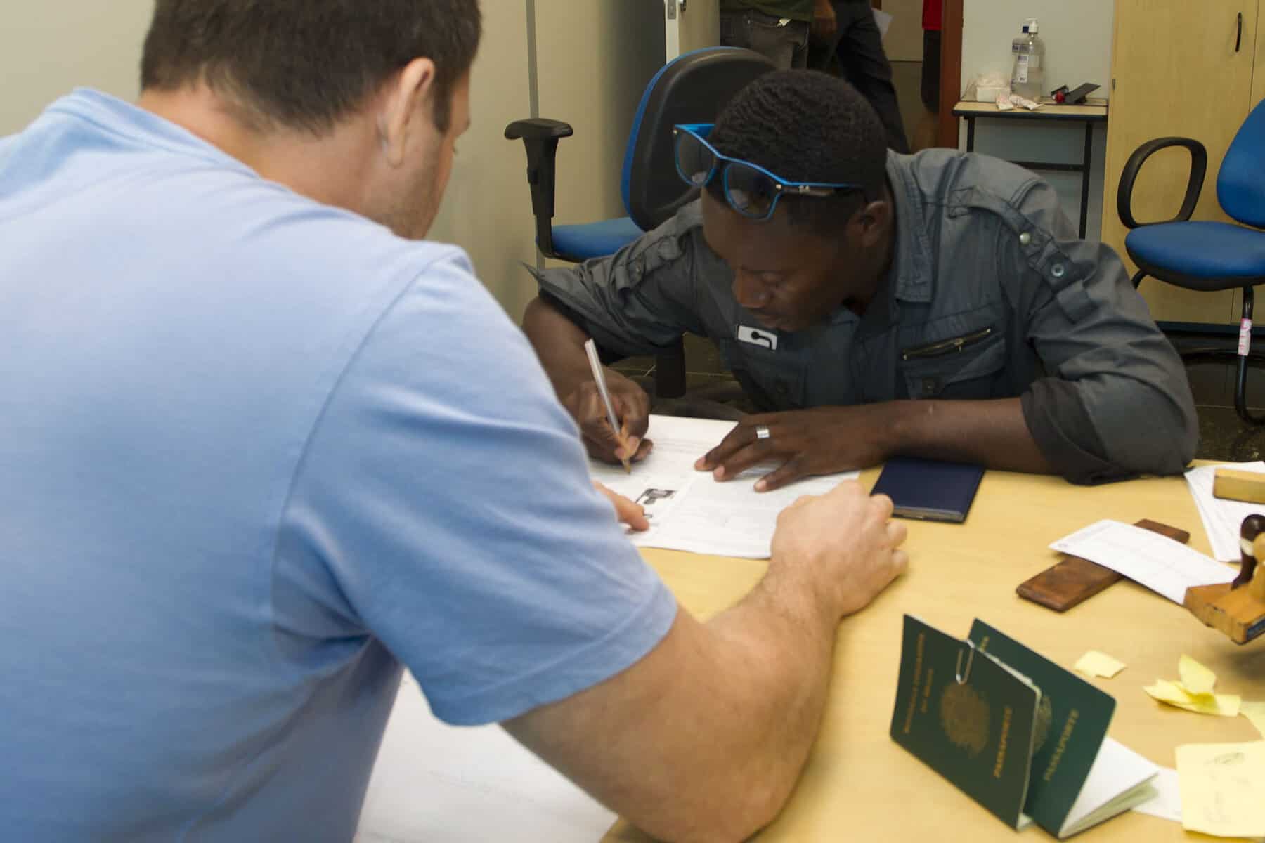 Os haitianos apresentam passaporte, preenchem formulário e são colhidas as digitais. “O registro é lançado no banco de dados nacionais, pois eles vão passar a viver no Brasil e é necessário controle”, explica o agente Melo. O processo é enviado para Brasília para aguardar resposta. O protocolo permitirá ao Ministério do Trabalho expedir carteira de trabalho provisória, para o exercício de atividade remunerada no país.