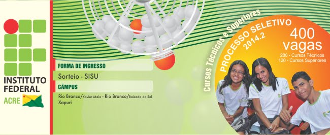O Instituto Federal do Acre – IFAC está oferecendo 120 vagas em cursos superiores para o segundo semestre de 2014 através do Sistema de Seleção Unificada (Sisu) do Ministério da Educação. As inscrições começam na próxima segunda-feira, 2, e ficam até as 21h59 de 4 de junho (horário do Acre).
