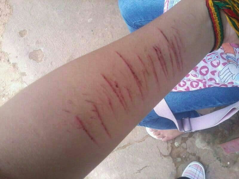 De acordo com outra mãe que também pediu para não ser identificada, ela tem duas filhas que estudam na Escola Alcimar Nunes Leitão e que um dia foi chamada a comparecer a escola onde a coordenadora lhe mostrou uma página de papel com os nomes de 13 alunas, uma lamina de apontador e outra de barbear sobre o papel ainda sujas de sangue.