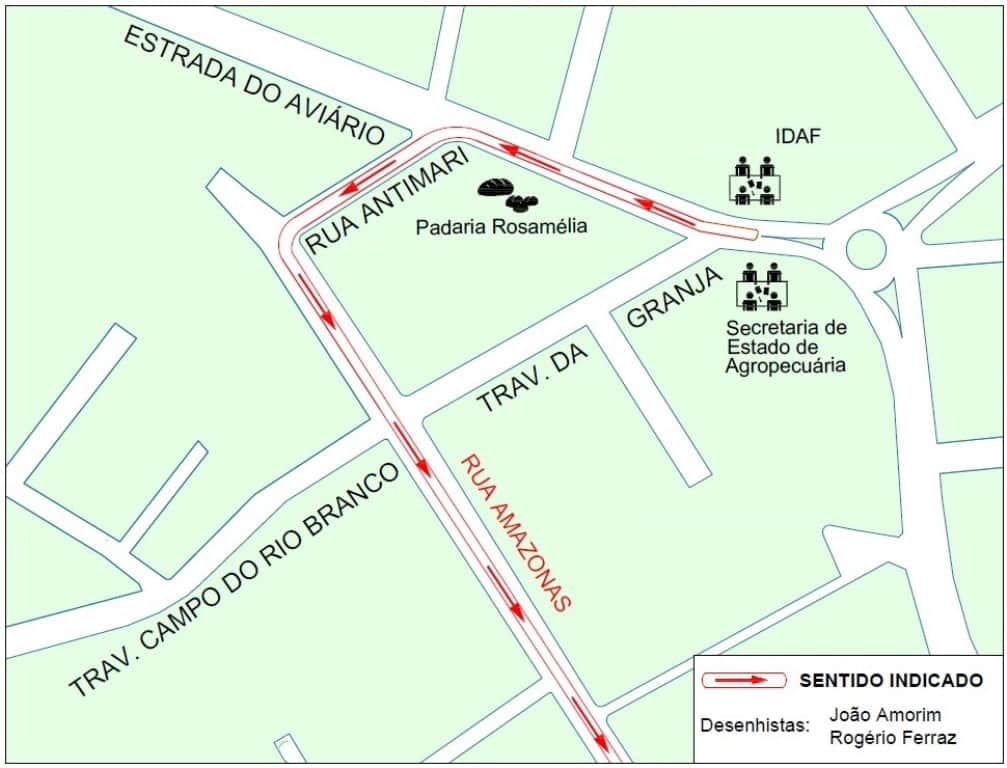 A Prefeitura de Rio Branco, por meio da Rbtrans, segue promovendo alterações necessárias no trânsito visando oferecer para a população maior fluidez e segurança nas ruas da cidade. Nesta quinta-feira, dia 17 de julho, a autarquia responsável pelo trânsito e o transporte na Capital contemplou as seguintes vias: travessas da Granja, Campo do Rio Branco e Rua Antimari, localizadas no Bairro Capoeira, que passaram de duplo sentido de circulação para sentido único de direção.