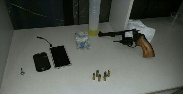 Ao passarem no local, os policiais avistaram a moto suspeita e fizeram o acompanhamento, eles abordaram os acusados e ao revistarem os suspeitos encontraram um revólver calibre 38 com 6 munições intactas e os dois celulares das vítimas. Descobriram também que a motocicleta havia sido furtada.