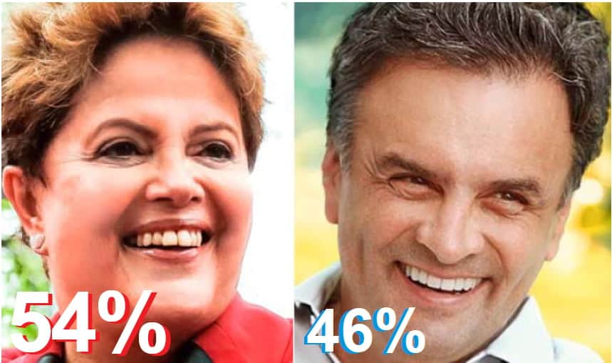 Pesquisa Ibope divulgada nesta quinta-feira (23) aponta os seguintes percentuais de votos válidos no segundo turno da corrida para a Presidência da República: – Dilma Rousseff (PT): 54% – Aécio Neves (PSDB): 46%.