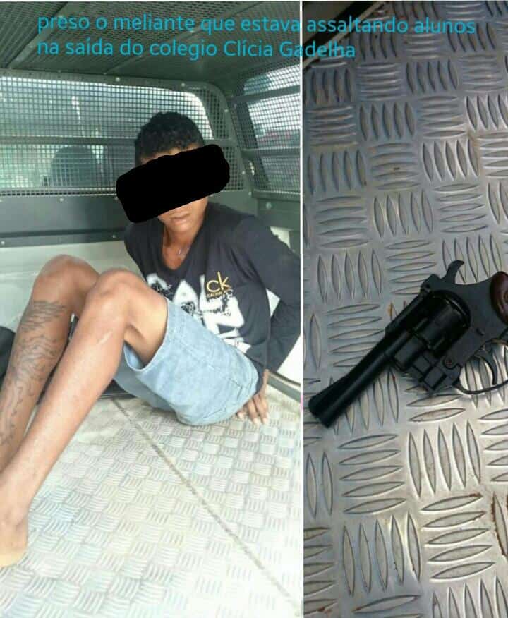 De acordo com uma das vítimas, quando estava saindo da escola Clicia Gadelha, o acusado a abordou e roubou sua bolsa e celular. Ao ser preso, o menor estava em posse de um revolve calibre 38.