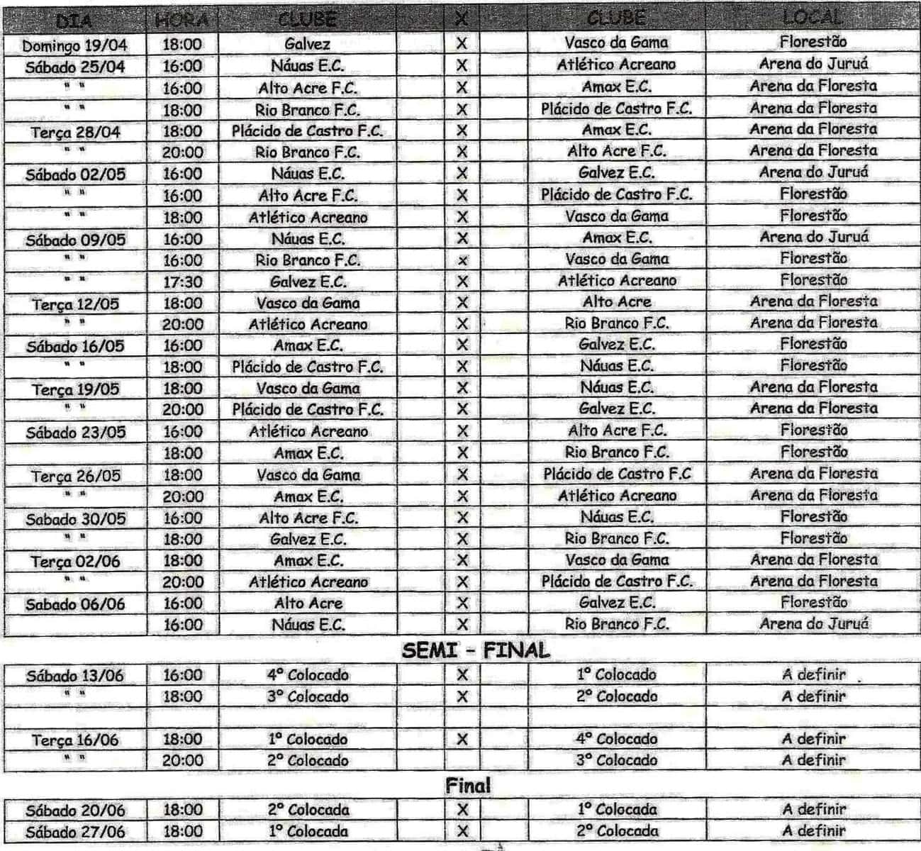 O departamento técnico da Federação de Futebol do Acre (FFAC) divulgou nesta quarta-feira (22) a tabela completa do segundo turno e da fase final do Campeonato Acreano 2015. Por decisão da maioria dos clubes, os jogos do returno e as semifinais/finais serão disputados às terças e aos sábados.