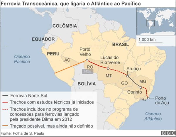 Neste contexto, a Ferrovia Transoceânica, cujo custo é estimado em até US$ 10 bilhões (R$ 30 bilhões), poderia cobrir as necessidades dos vários países envolvidos.