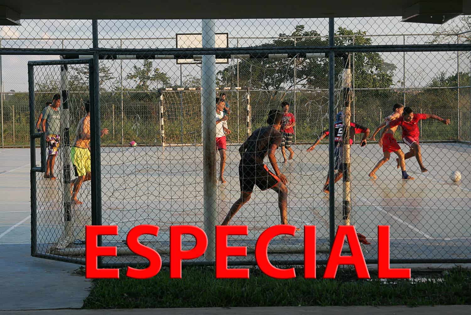 As praças da Cidade do Povo são espaços bonitos para as crianças. Elas riem, correm e se divertem pelo playground, gramados e pistas de corrida. Só que elas não são maioria. Os adolescentes e jovens é que mais frequentam o lugar. E, para eles, falar em praça da juventude é sinônimo de apenas uma coisa: ‘pelada’. A rapaziada só quer saber de jogar uma bolinha nas quadras. E as garotas também. Mesmo que sejam quadras poliesportivas, o futebol é soberano lá.