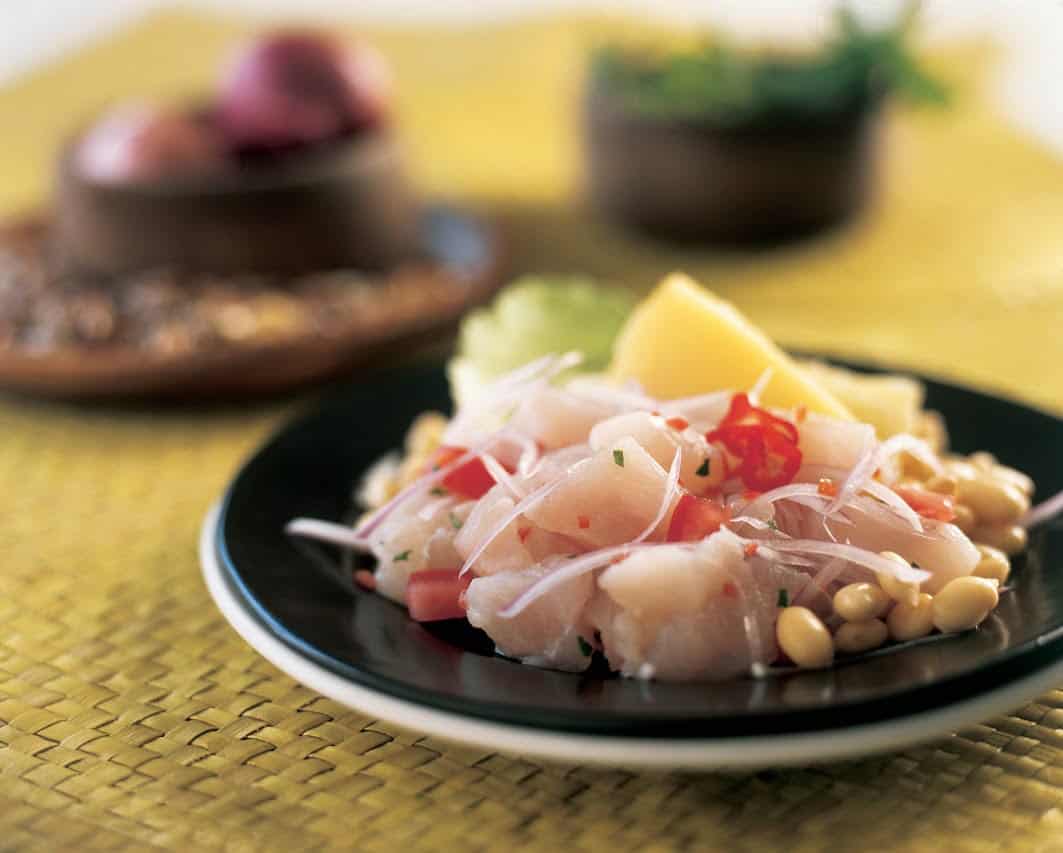 Opções de Entrada: Ceviche de pescado ou Papa a la Huancaína