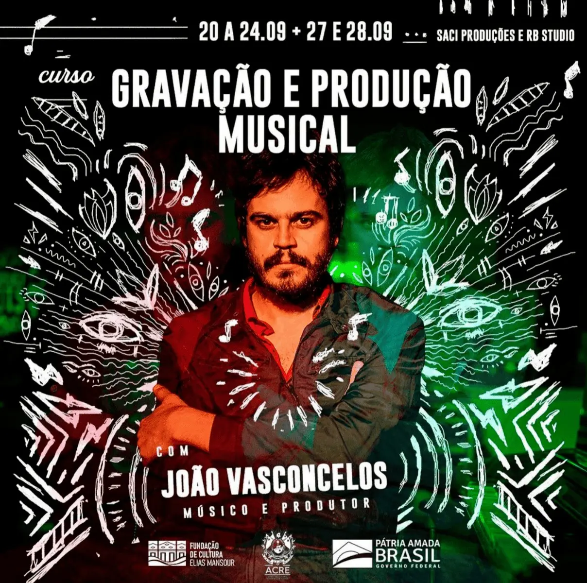 O músico acreano João Vasconcelos realizará, entre os dias 20 e 28 de setembro, o “Curso de Gravação e Produção Musical”, na sede da Saci Produções e RB Studio. A iniciativa conta com financiamento da Lei Aldir Blanc, por meio da Fundação Elias Mansour, e é voltada para a capacitação e transmissão de noções básicas acerca de processos de produção musical e técnicas de gravação em estúdio.