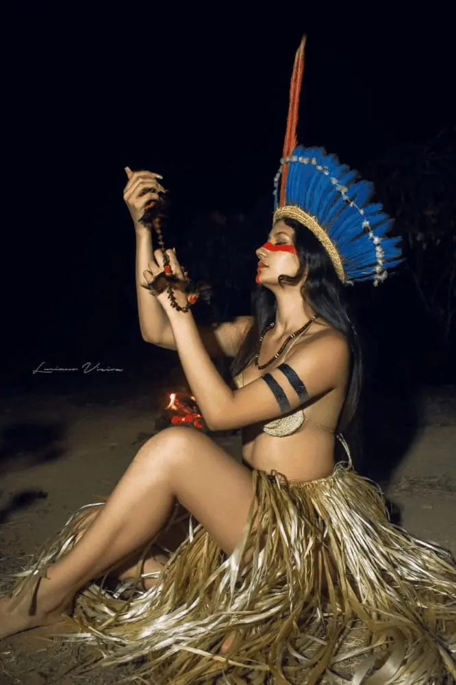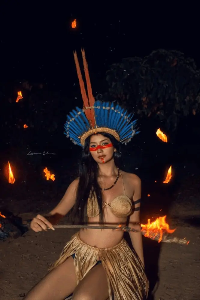 Neta de indígenas, a Miss chegou a morar quase dois anos na aldeia Caxarari, em Rondônia, durante a pandemia. Valorizando a cultura da família e do estado, ela realizou um ensaio fotográfico no local.