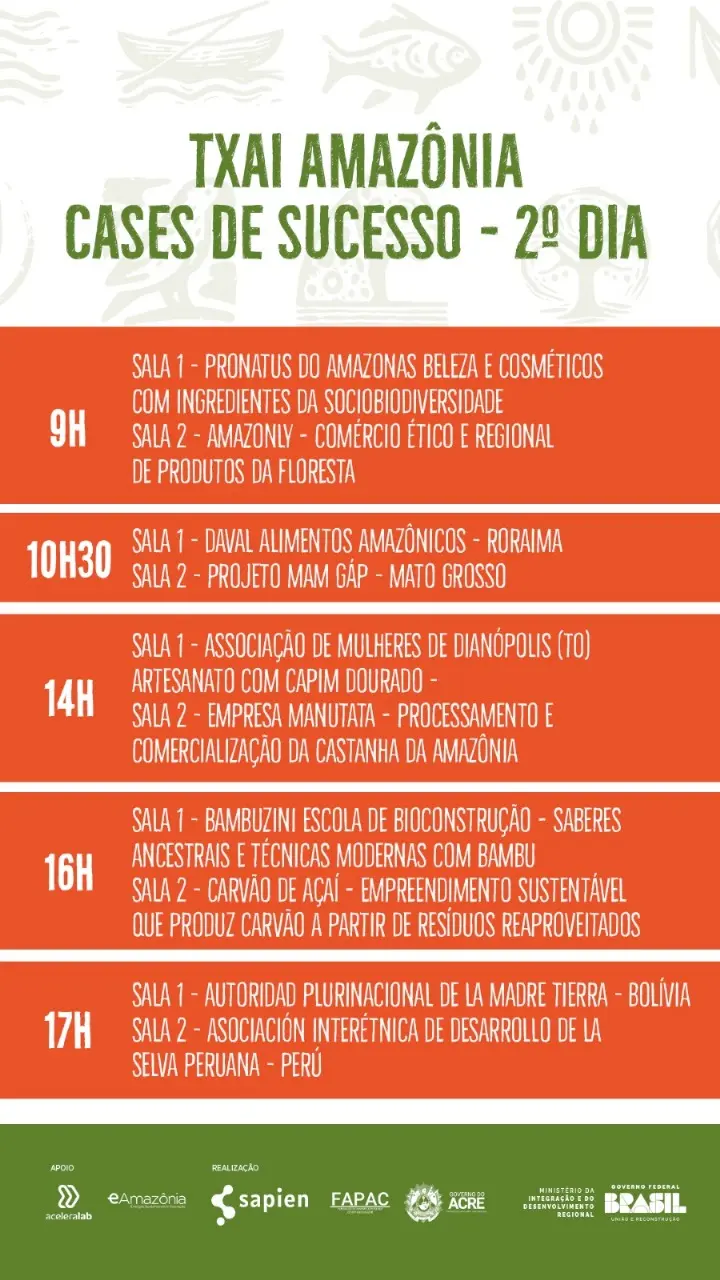 Entre as principais atrações do dia, um destaque especial para os cases de empreendimentos da bioeconomia dos estados do Acre, Amazonas, Pará, Roraima, Mato Grosso, Tocantins e dos países vizinhos Peru e Bolívia.