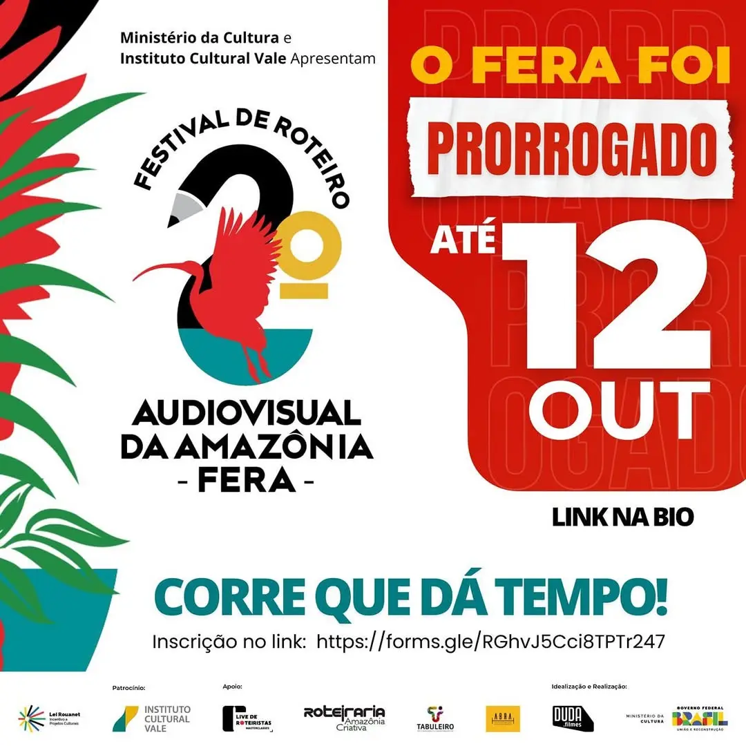 Inscrições para o Festival de Roteiro da Amazônia são prorrogadas até 12 de outubroO festival tem formato híbrido, dividido em duas etapas: a 1ª etapa on-line: acontecerá em novembro de 2025, com a realização de laboratórios e atividades formativas. Já a etapa presencial acontecerá de 12 a 14 de dezembro de 2025, em Belém (PA), reunindo os selecionados em oficinas, mentorias e rodadas de negócios.