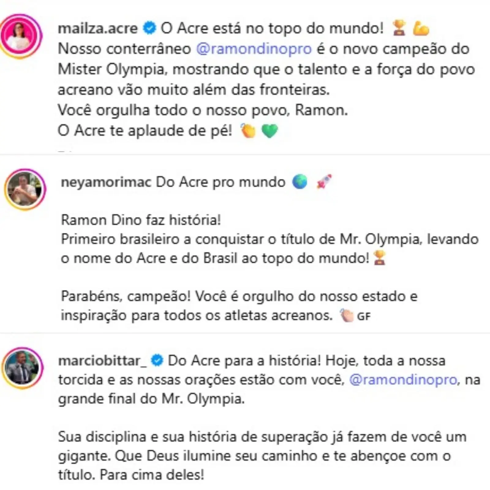 “Nosso @ramondinopro, filho da nossa terra, conquistou o título de CAMPEÃO MUNDIAL no Mr. Olympia, na categoria Classic Physique, levando o nome do Acre e do Brasil ao topo do fisiculturismo internacional! O PRIMEIRO brasileiro a conquistar tal feito.”