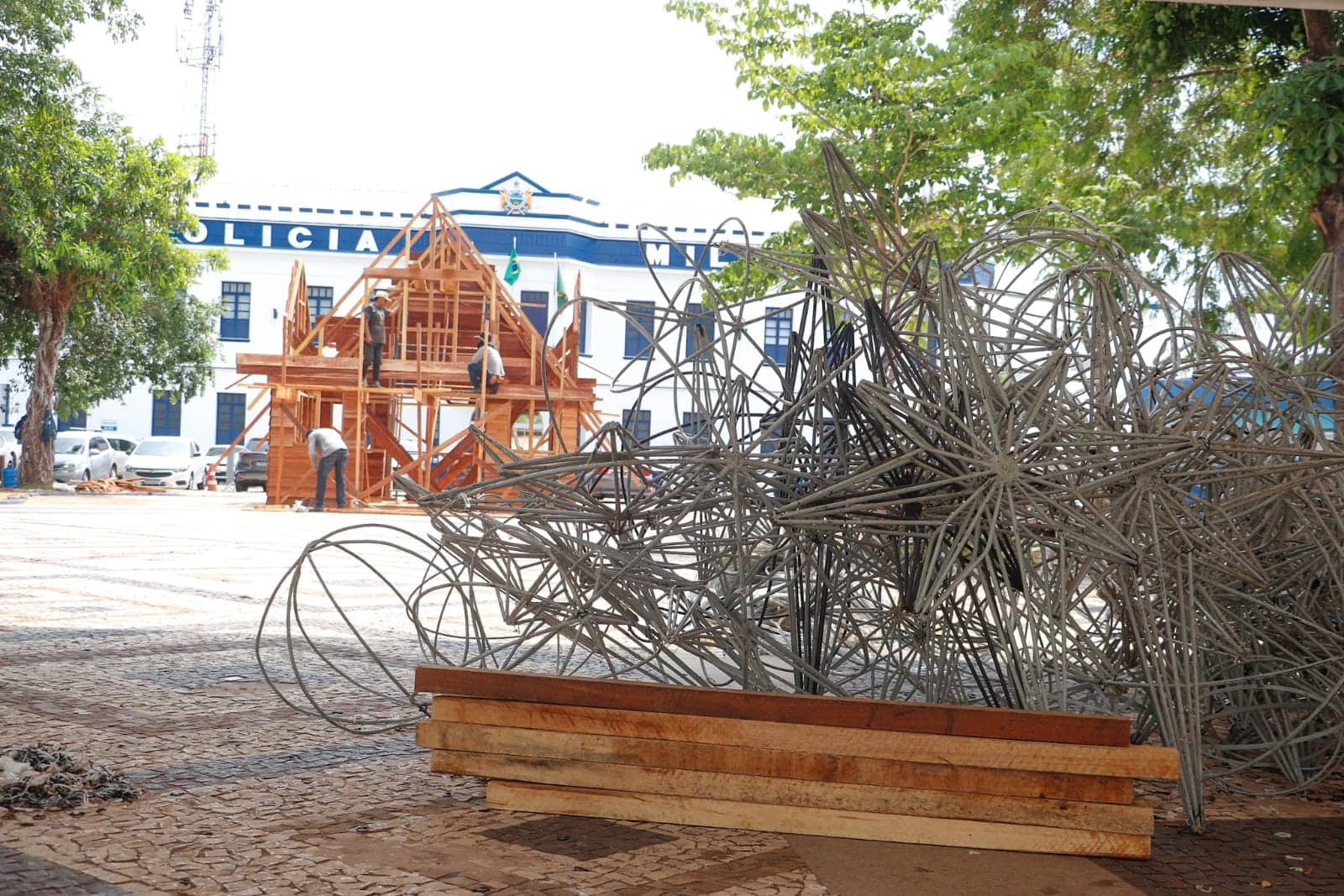 Decorações metálicas, reaproveitadas do Natal passado, também estão dispostas no calçadão da praça e deverão ser colocadas nas árvores e estruturas do local.