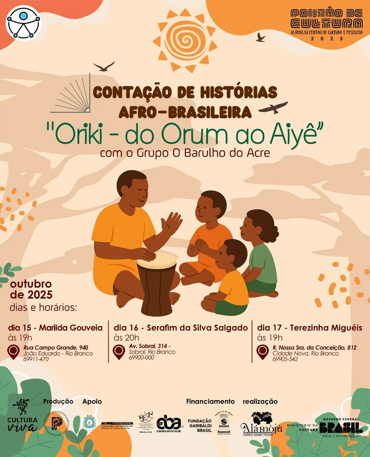 “Oriki – do Orum ao Aiyê” é uma realização do Alámòjú Centro de Cultura e Pesquisa. O projeto conta com o apoio do Ministério da Cultura e do Governo Federal, e é financiado pela Fundação Garibaldi Brasil (FGB)/ Prefeitura de Rio Branco.