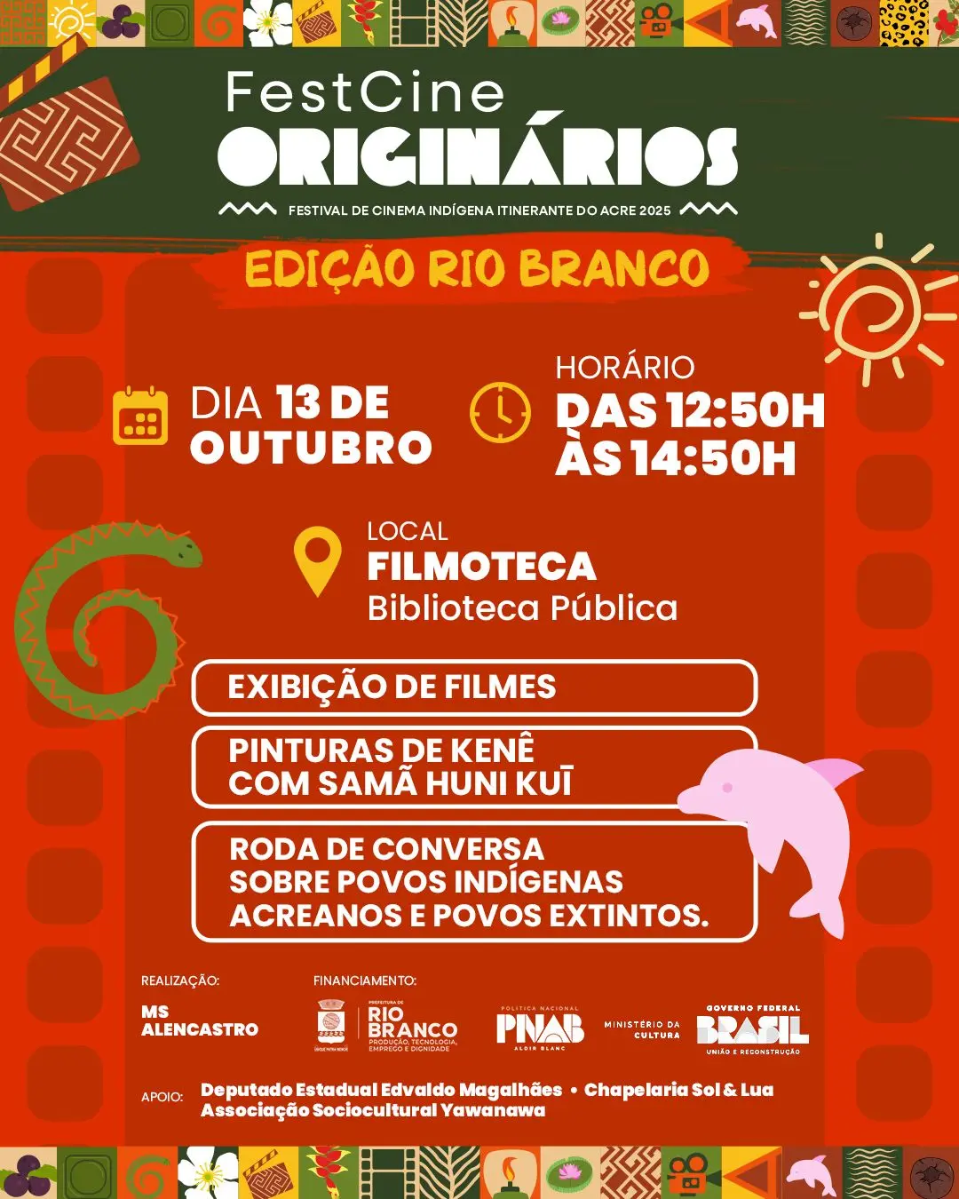 FestCine Originários 2025 realiza sessão de encerramento em Rio BrancoA sessão final será realizada na Filmoteca Acreana da Biblioteca Pública, no Centro de Rio Branco, das 12h50 às 14h50. Os estudantes terão a oportunidade de assistir a quatro curtas-metragens especialmente selecionados, celebrando a produção audiovisual indígena.