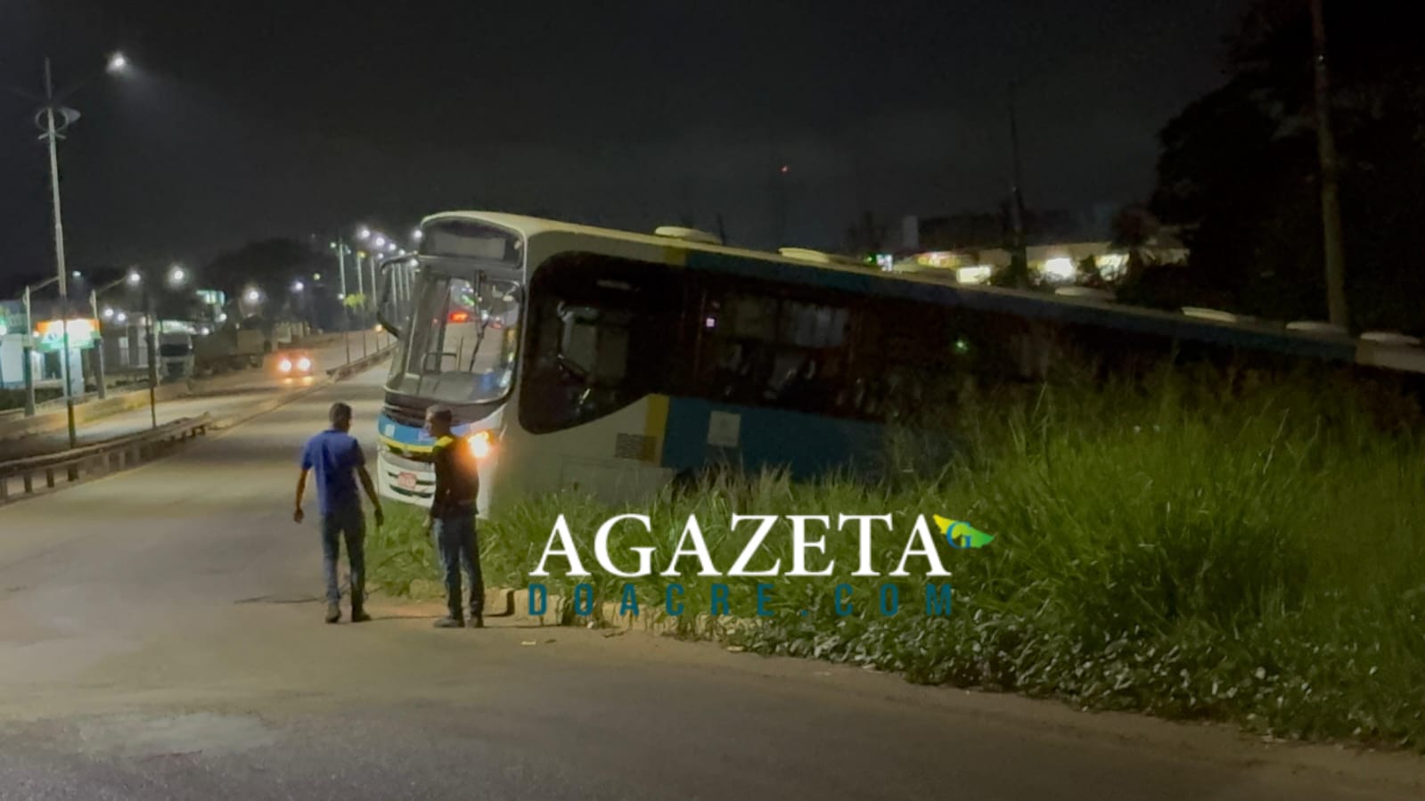 O motorista de um ônibus da Ricco Transportes perdeu o controle do veículo e acabou descendo uma ribanceira às margens da BR-364, no km 1, nas proximidades da ponte sobre o Igarapé Judia, no bairro Belo Jardim 1, durante a madrugada desta quarta-feira, 19, em Rio Branco. O coletivo retornava para a garagem depois de completar o trajeto sentido Centro–bairro.