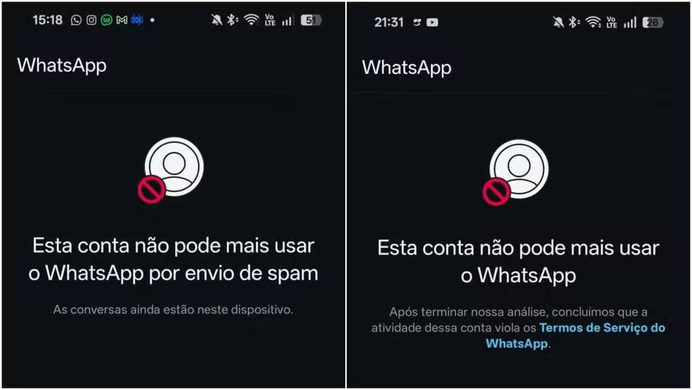 Segundo Ariel, assim que sua conta foi desconectada, o app exibiu uma mensagem informando que o perfil havia sido bloqueado por suspeita de spam. Ele contou que questionou o motivo, mas o WhatsApp informou que havia concluído a análise e que a conta permaneceria banida.