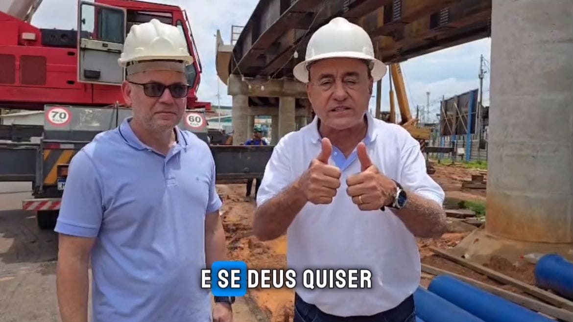 Bocalom aparece ao lado do vice-prefeito Alysson Bestene e agradece o apoio do governador Gladson Camelí, além da emenda parlamentar do senador Márcio Bittar. Segundo o prefeito, a última viga de aço foi instalada e o cronograma segue dentro do previsto.