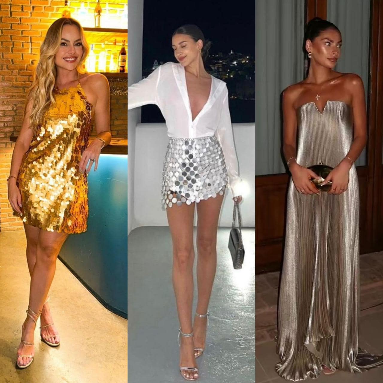 Aqui, vale ousar mais. “Brilho, metalizados, paetês e tecidos acetinados estão super em alta.” A designer sugere equilibrar peças fashion com conforto para curtir a noite inteira, usando acessórios marcantes sem exagero.