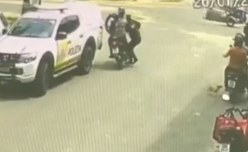 Logo em seguida, outro policial corre até os ocupantes do veículo para impedir a fuga. O passageiro desce da moto e se rende com as mãos erguidas. O condutor foi detido e encaminhado à delegacia.