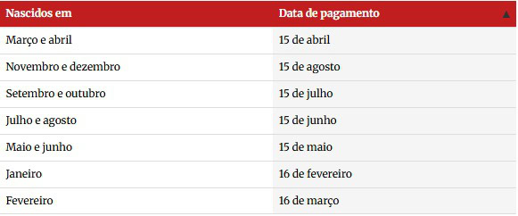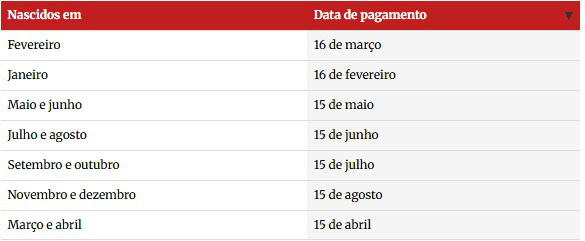 Quem nasceu em fevereiro, por exemplo, recebe a partir de 16 de março. Os pagamentos seguem até agosto, quando ocorre a última liberação do ano.