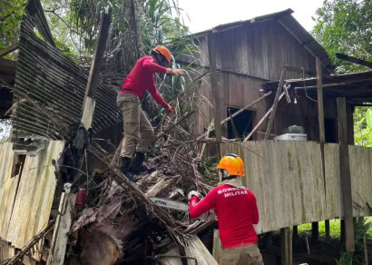 Ao chegarem ao local, os bombeiros notaram que a árvore havia atingido parte da residência, comprometendo a estrutura e oferecendo risco à segurança da região. A equipe iniciou o trabalho de remoção, cortando a árvore em partes para facilitar a retirada.
