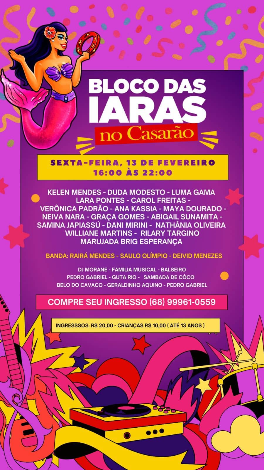 O tradicional Casarão, no centro da capital, abre suas portas nesta sexta-feira, 13, para receber o Bloco das Iaras, um dos eventos mais aguardados para o pontapé inicial da folia acreana. Com uma proposta vibrante e diversificada, a festa promete seis horas ininterruptas de música, começando às 16h e seguindo até as 22h.