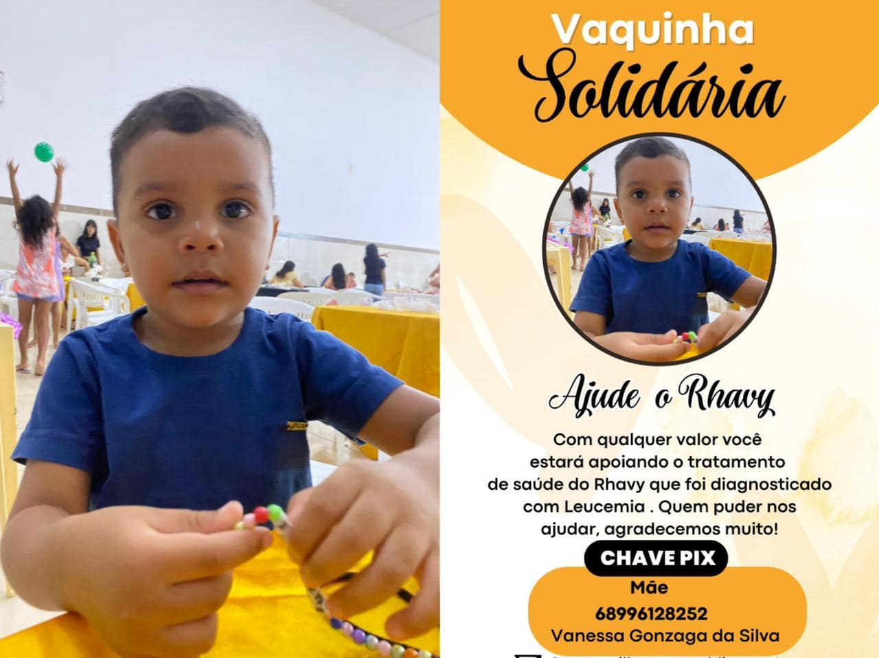 A família de Rhavy, de 3 anos, iniciou uma campanha solidária para arrecadar recursos destinados ao tratamento do menino, diagnosticado com leucemia. A mobilização busca apoio financeiro para cobrir despesas com alimentação, transporte e estadia em Rio Branco, onde a criança realiza acompanhamento médico.