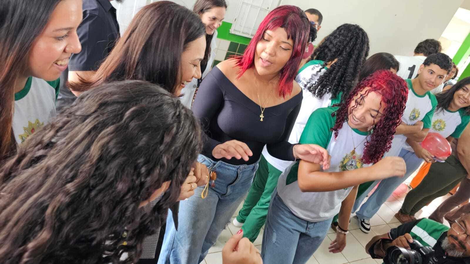 Mailza Assis dança com estudantes durante abertura do ano letivo em escola
