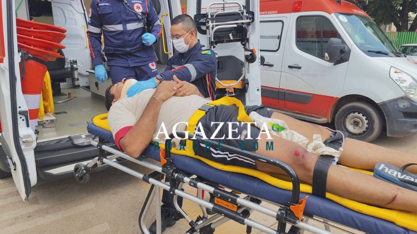 Uma colisão envolvendo duas motocicletas deixou Acsson Pereira da Silva, de 20 anos, Josué Gonçalves da Silva, de 26 anos, e Ana Paula Barbosa Barroso, de 29 anos, feridos no entroncamento da Rua Luiz Gonzaga com a Travessa Joaquim Macedo, no bairro Vitória, em Rio Branco, durante a tarde deste domingo (8).