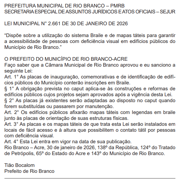 Nesta quarta-feira, 4, o prefeito Tião Bocalom sancionou a Lei Municipal nº 2.661, que estabelece a obrigatoriedade do sistema braille e de mapas táteis em edifícios públicos de Rio Branco. A medida busca oferecer mais independência para as pessoas com deficiência visual que precisam circular por órgãos e repartições municipais.