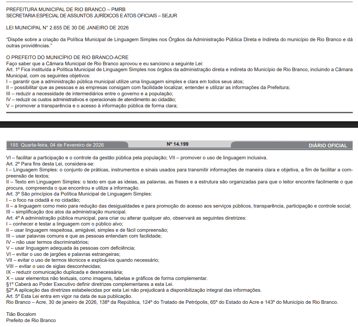 O acesso à informação pública em Rio Branco acaba de ganhar um reforço. Foi sancionada, nesta quarta-feira, 4, pelo prefeito Tião Bocalom a Lei Municipal nº 2.655, que institui a Política Municipal de Linguagem Simples. A medida, que já está em vigor, promete transformar a maneira como a Prefeitura e a Câmara Municipal se comunicam com a população.