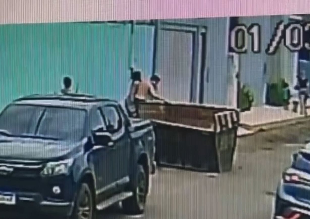 Quando chegam próximos a um papa-entulho, a mulher volta a apontar para o chão e se abaixa para pegar algo. Nesse momento, o servidor se aproxima, empurra a vizinha e desfere um tapa no rosto dela.