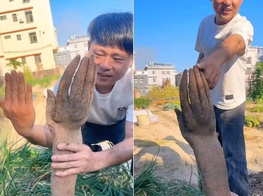 Afinal, uma mão, acompanhada de dedos bem definidos e até unhas, com antebraço saindo da terra seria capaz de assustar qualquer um. Mas a descoberta não passava de um inhame, incrivelmente parecido com uma parte do corpo de uma pessoa!