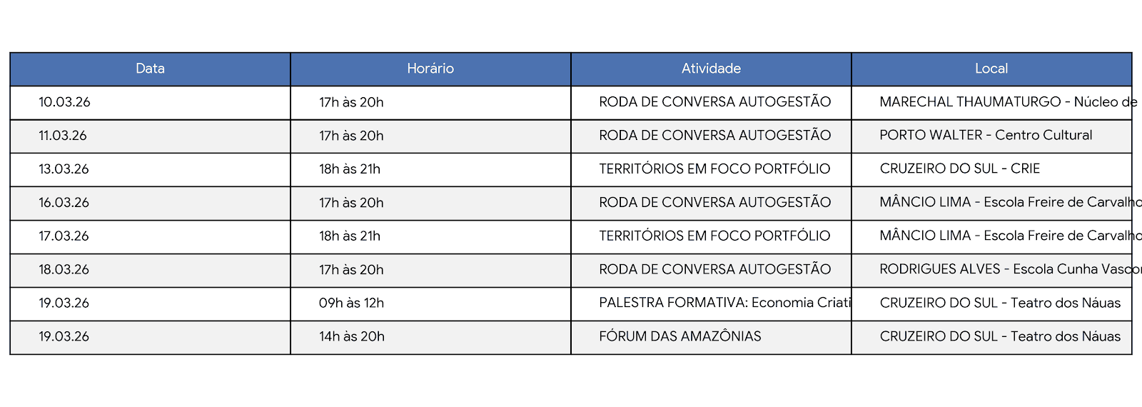 Na semana seguinte, o município de Mâncio Lima recebe dois dias de programação na Escola Freire de Carvalho: uma Roda de Autogestão na segunda (16/03) e a oficina de portfólios na terça (17/03). O ciclo de rodas de conversa pelo interior encerra-se em Rodrigues Alves, na quarta-feira (18/03), na Escola Cunha Vasconcelos.