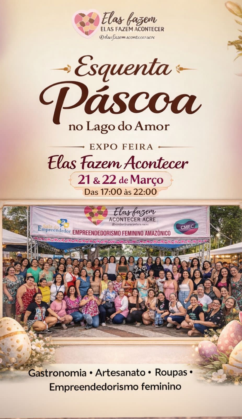 O mês de março em Rio Branco ganha um evento especial que une a celebração da Páscoa ao fomento do empreendedorismo feminino acreano. O “Esquenta Páscoa”, promovido pelo coletivo Elas Fazem Acontecer, será realizado no próximo sábado e domingo, 21 e 22, no Lago do Amor, das 17h às 22h, e promete ser um ponto de encontro para a economia criativa local.