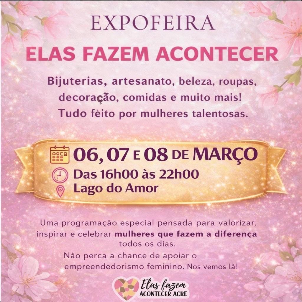 Em celebração ao Mês da Mulher, a capital acreana recebe a partir desta sexta-feira, 7, a ExpoFeira “Elas Fazem Acontecer”. O evento, que busca valorizar a força e o talento feminino na economia local, será realizado nos dias 6, 7 e 8 de março, ocupando o espaço do Lago do Amor das 16h às 22h.