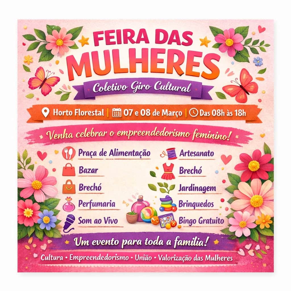 O Horto Florestal de Rio Branco será palco, neste sábado, 7, e domingo, 8, da Feira das Mulheres. Organizado pelo Coletivo Giro Cultural, o evento celebra o empreendedorismo feminino local e reúne 30 empreendimentos liderados exclusivamente por mulheres, funcionando das 08h às 18h.