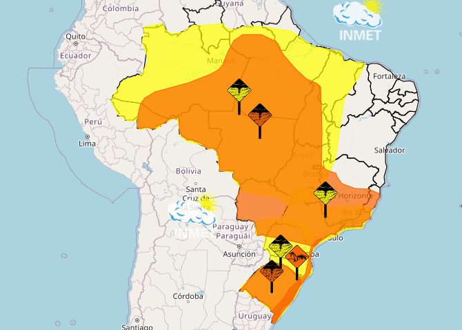 O monitoramento aponta para riscos que variam de “perigo potencial” a “perigo” real, com previsão de ventos fortes e acumulados significativos de chuva até a próxima segunda-feira, 9.