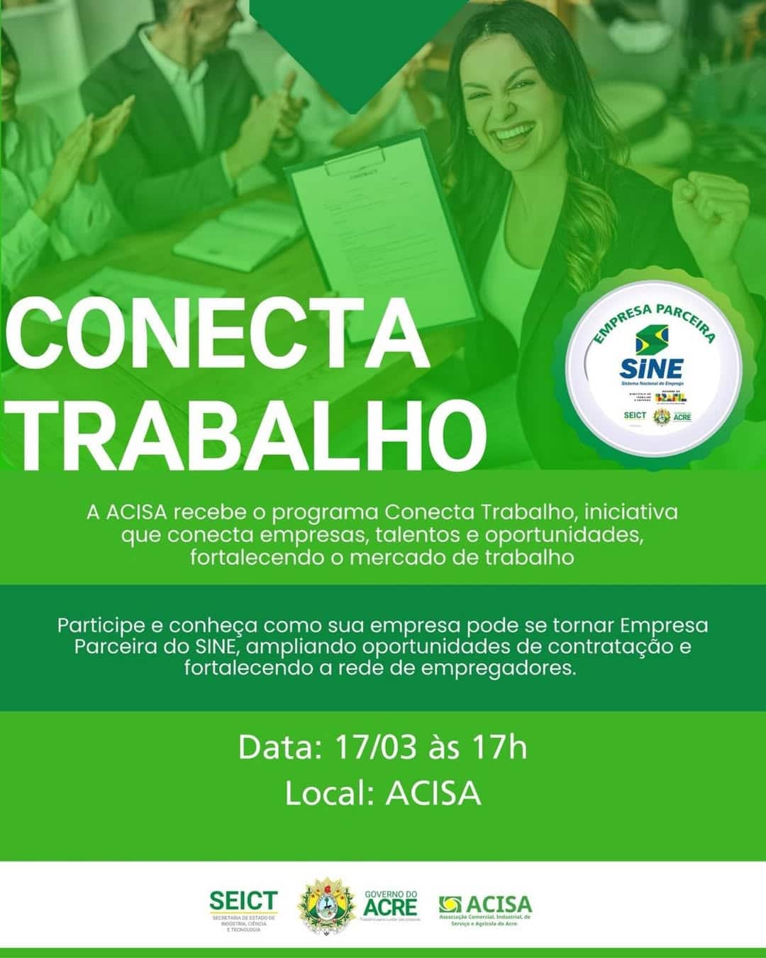 O Sistema Nacional de Emprego (Sine) no Acre apresenta, na próxima terça-feira, 17, o programa Conecta Trabalho, uma nova estratégia de recrutamento e seleção voltada para o fortalecimento do mercado de trabalho local. O lançamento da iniciativa acontece na sede da Associação Comercial, Industrial, de Serviço e Agrícola do Acre (Acisa), em Rio Branco, a partir das 17h.