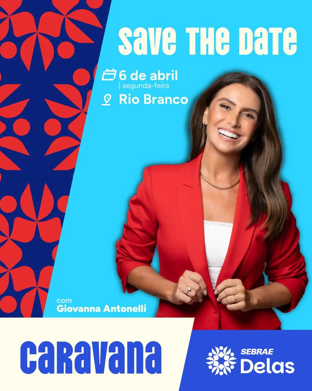 O cenário do empreendedorismo feminino no Acre ganhará um reforço de peso no próximo mês. O Sebrae anunciou a chegada da Caravana Sebrae Delas a Rio Branco, marcada para o dia 6 de abril, uma segunda-feira. O grande destaque do evento será a participação especial da atriz e empresária Giovanna Antonelli, reconhecida nacionalmente por sua trajetória de sucesso no mundo dos negócios.