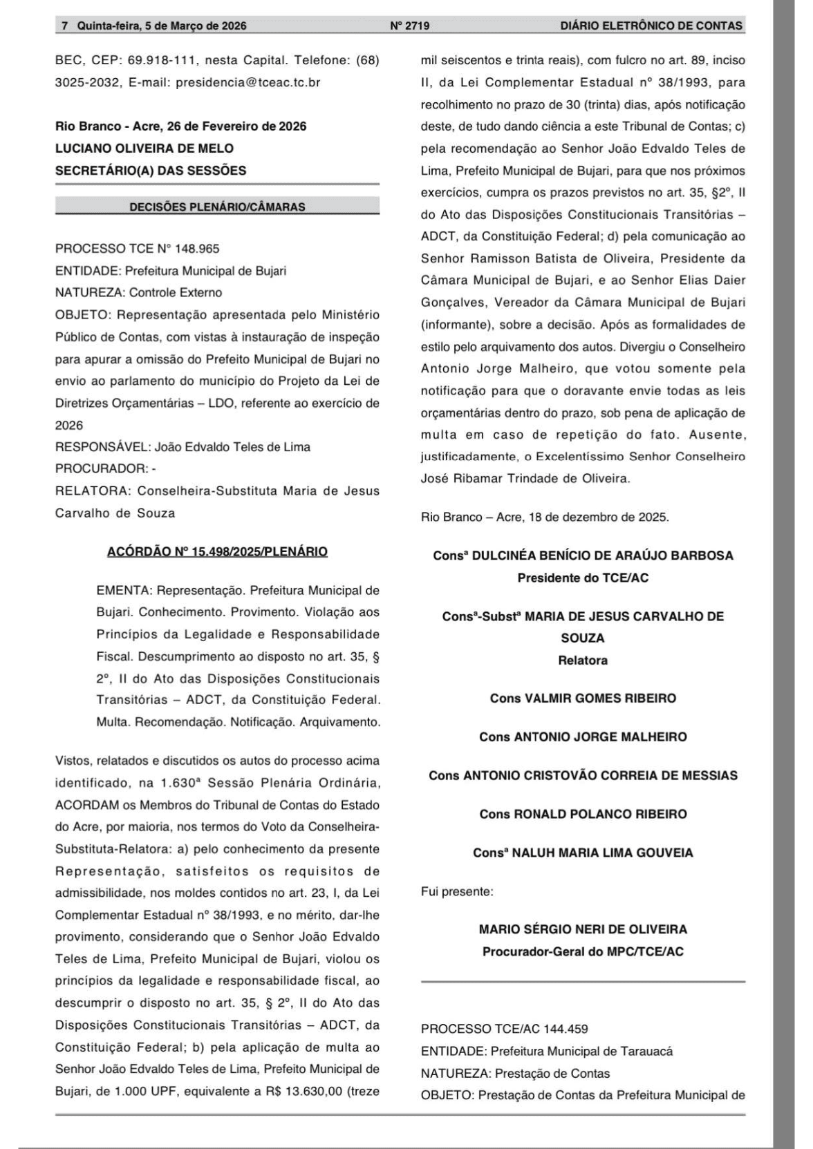 O Tribunal de Contas do Estado (TCE-AC) decidiu multar o prefeito de Bujari, João Edvaldo Teles de Lima, conhecido como Padeiro, por não cumprir os prazos legais na gestão do município. A punição, publicada no Diário Eletrônico desta quinta-feira, 5, é decorrente do atraso no envio do projeto da Lei de Diretrizes Orçamentárias (LDO) para o ano de 2026 à Câmara de Vereadores.